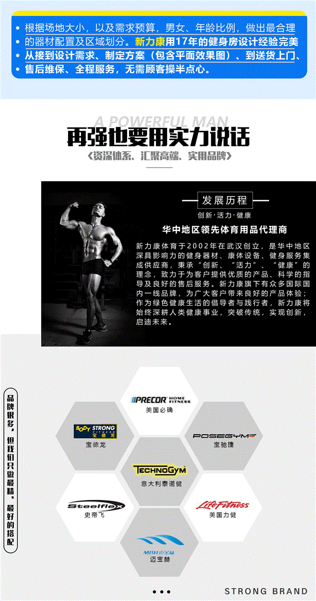 2002年,武汉新力康体育科技发展有限公司在武汉创立。公司秉承"诚信、品质、服务"的理念,吸引、汇聚行业精英,共同发展,现已成长为华中地区商用客户最多、自营网点最齐的的健身集成服务商,并成为众多连锁健身俱乐部和企事业指定供应商。
